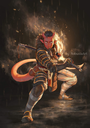 Tsubasa Oda, also known as Tsubasa the fiery, is the tiefling daimyo of the Tsugi region. He has a knack for socialization, easily mixing in with the crowd due to his easy-going nature. Despite his cheerful attitude, he’s quite the hot-head underneath who does not take well to mockery. Some would even say he undertakes action before thinking about it first.