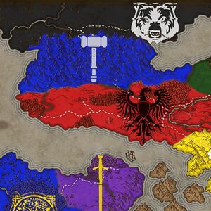 Teldin is the northern most country in mainland Erotria. This dwarven kingdom lies mainly beneath the Coroburn Heights with only the big gates and watchtowers connecting the vast tunnel network with the surface. The crest features a silver hammer on blue background.